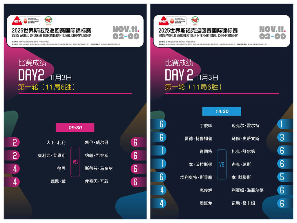 出战第三盘的其他种子选手,12号种子巴里·霍金斯击败了中国选手黄家豪,8号种子肖国栋则爆冷输给舒尔迪,成为了第三名种子选手。一号种子选手被淘汰出局。经过两天的角逐,2025年世界斯诺克巡回赛国际锦标赛前32名选手全部产生。丁俊晖、赵心童、张安达、斯佳慧等9名中国选手进入下一阶段的比赛。
